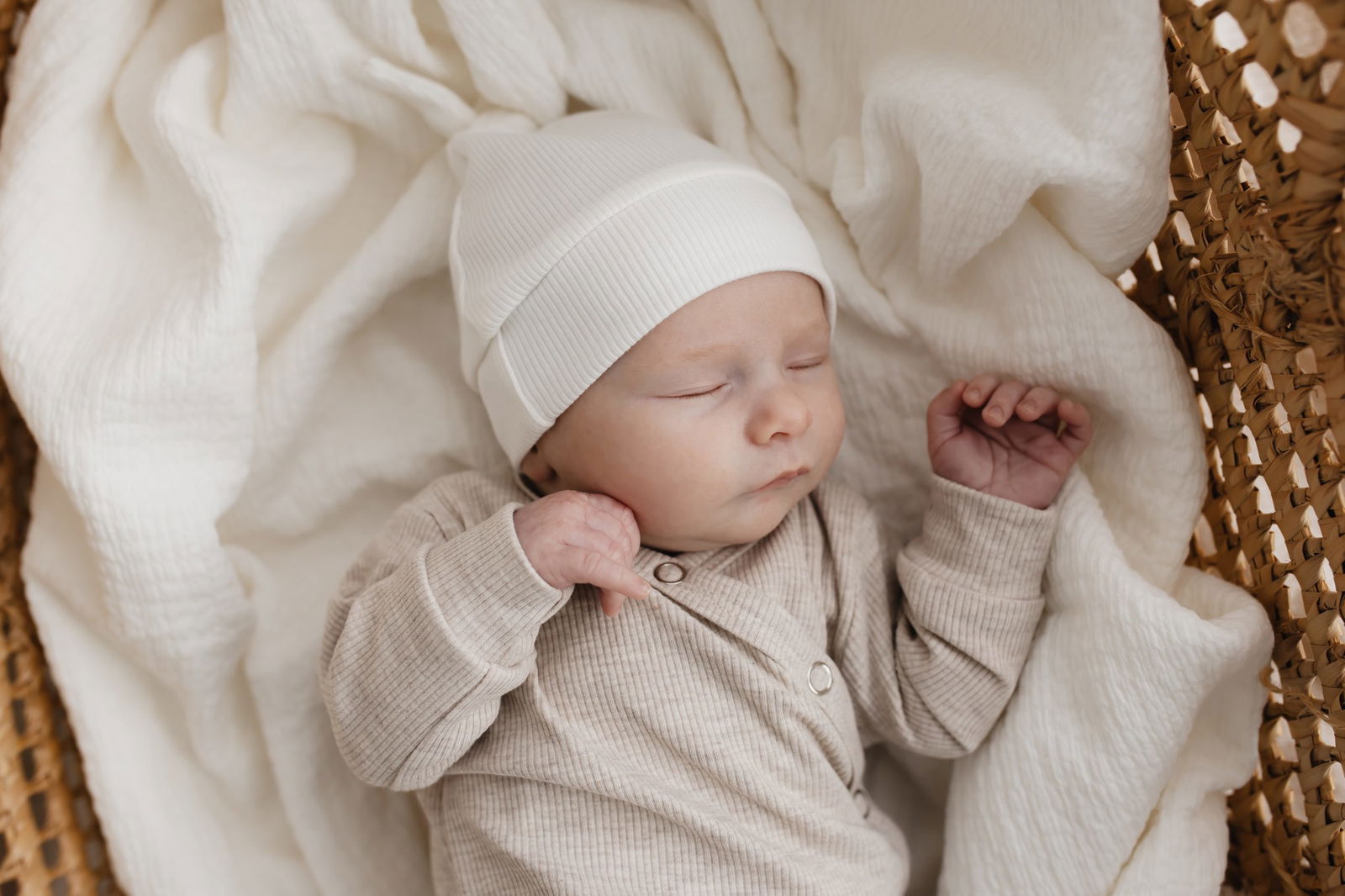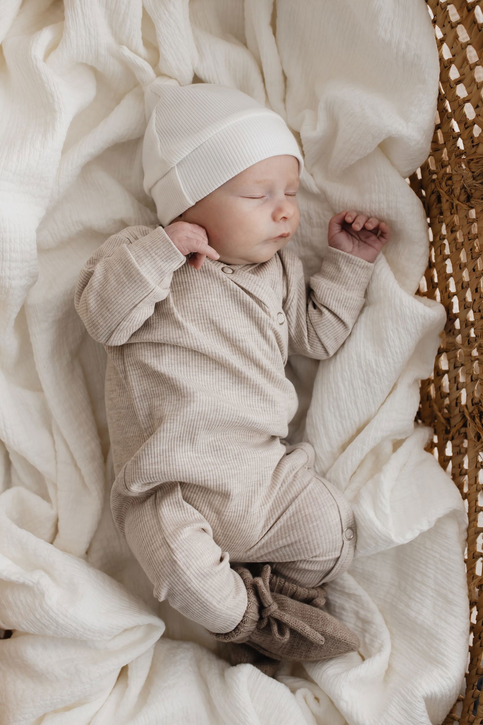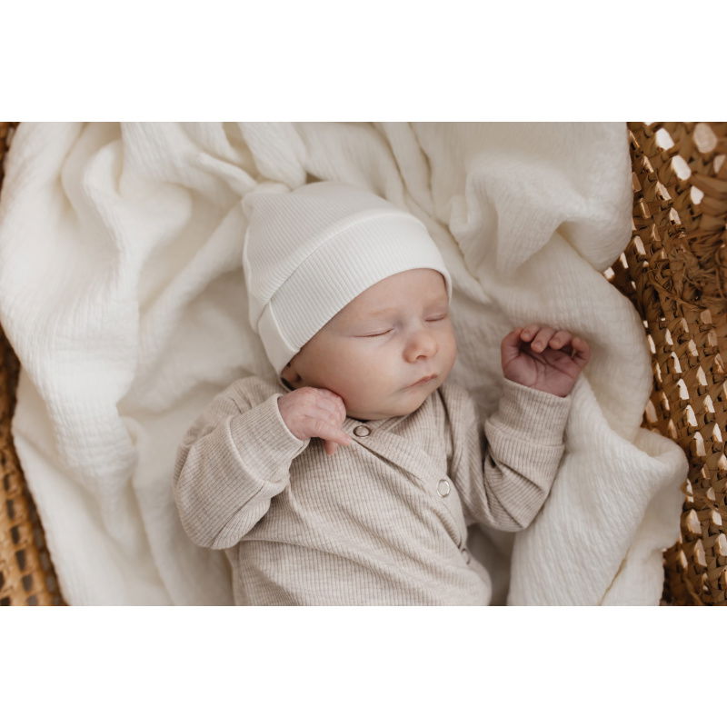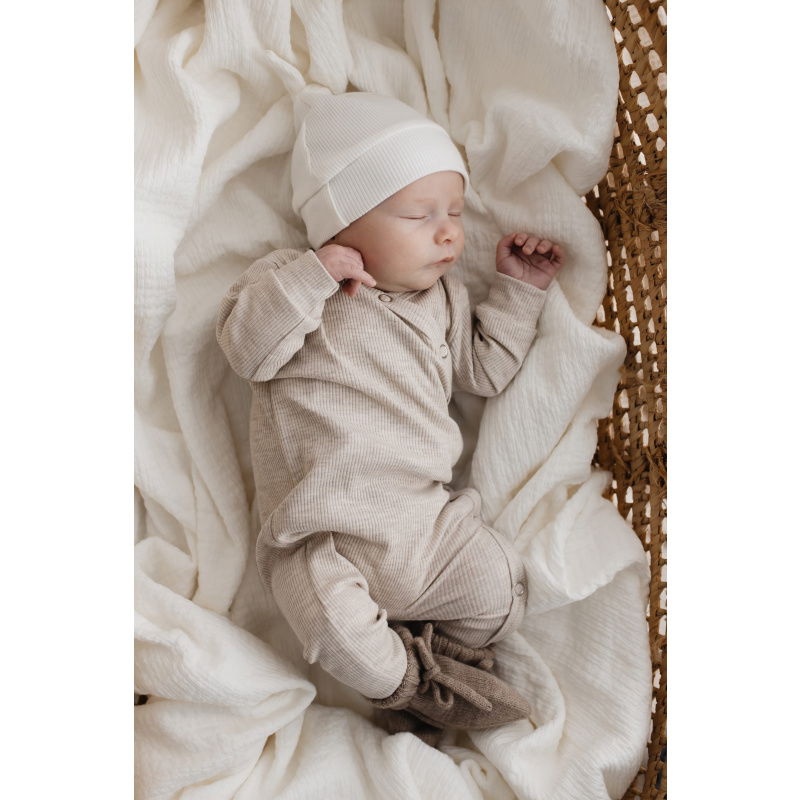Op de foto is het pakje gecombineerd met het mutsje rib ecru & de merino wollen slofjes sand.