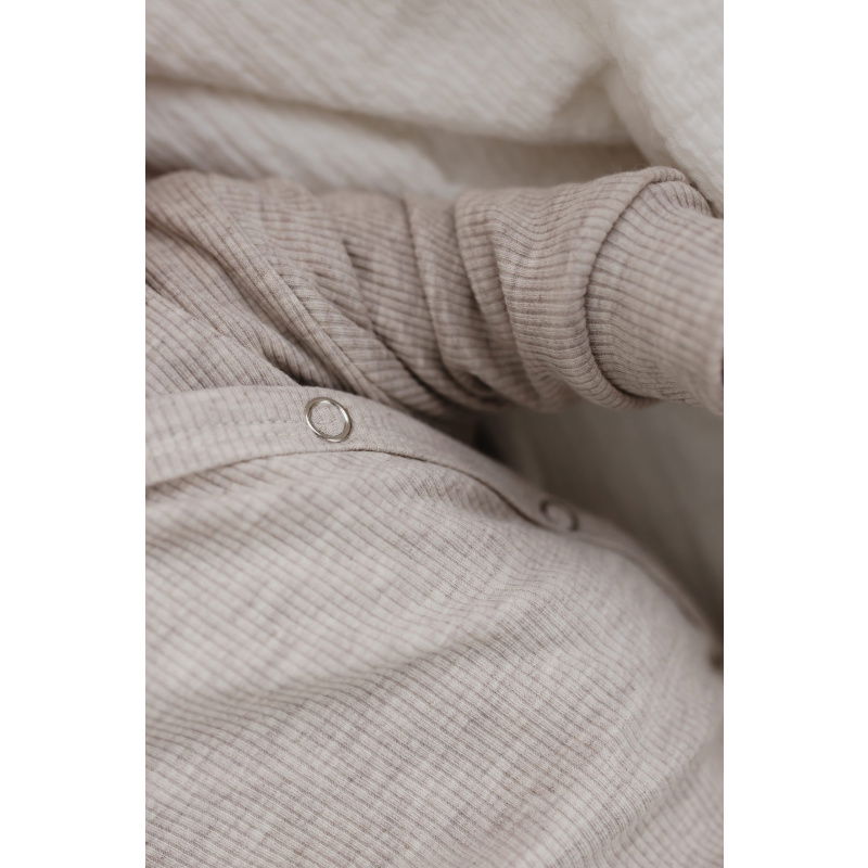 Dit boxpakje is gemaakt van een ribstof in de kleur beige melange. Het pakje bestaat uit één deel en kan voor jongens en meisjes. Aan de voorkant is het pakje voorzien van drukknopen. Hierdoor kan je je baby makkelijk verschonen en aan- en uitkleden.