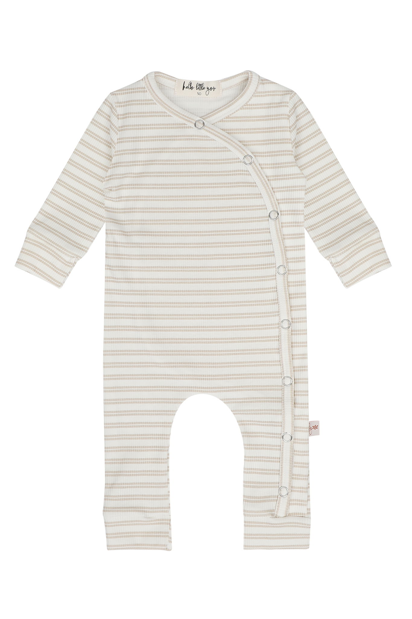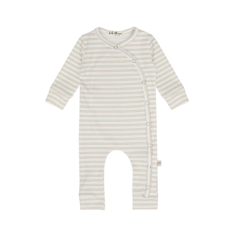 Dit fijne boxpakje is gemaakt van een rekbare ribstof met een streepjesprint in zand en ecru. Het pakje bestaat uit één deel. Aan de voorkant is het pakje voorzien van drukknopen. Hierdoor kan je je baby makkelijk verschonen en aan- en uitkleden.