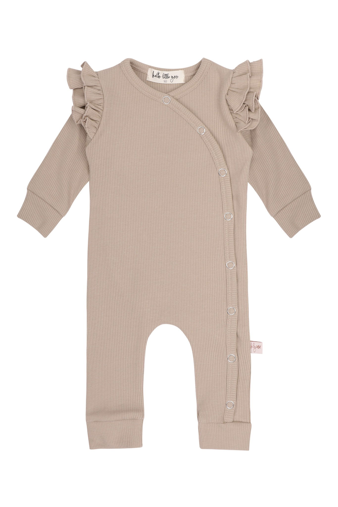 Dit boxpakje is gemaakt van een ribstof in de kleur taupe. Het pakje met ruffles op de schouders bestaat uit één deel is zo lief voor de allerkleinste meisjes. Aan de voorkant is het pakje voorzien van drukknopen. Hierdoor kan je je baby makkelijk verschonen en aan- en uitkleden.