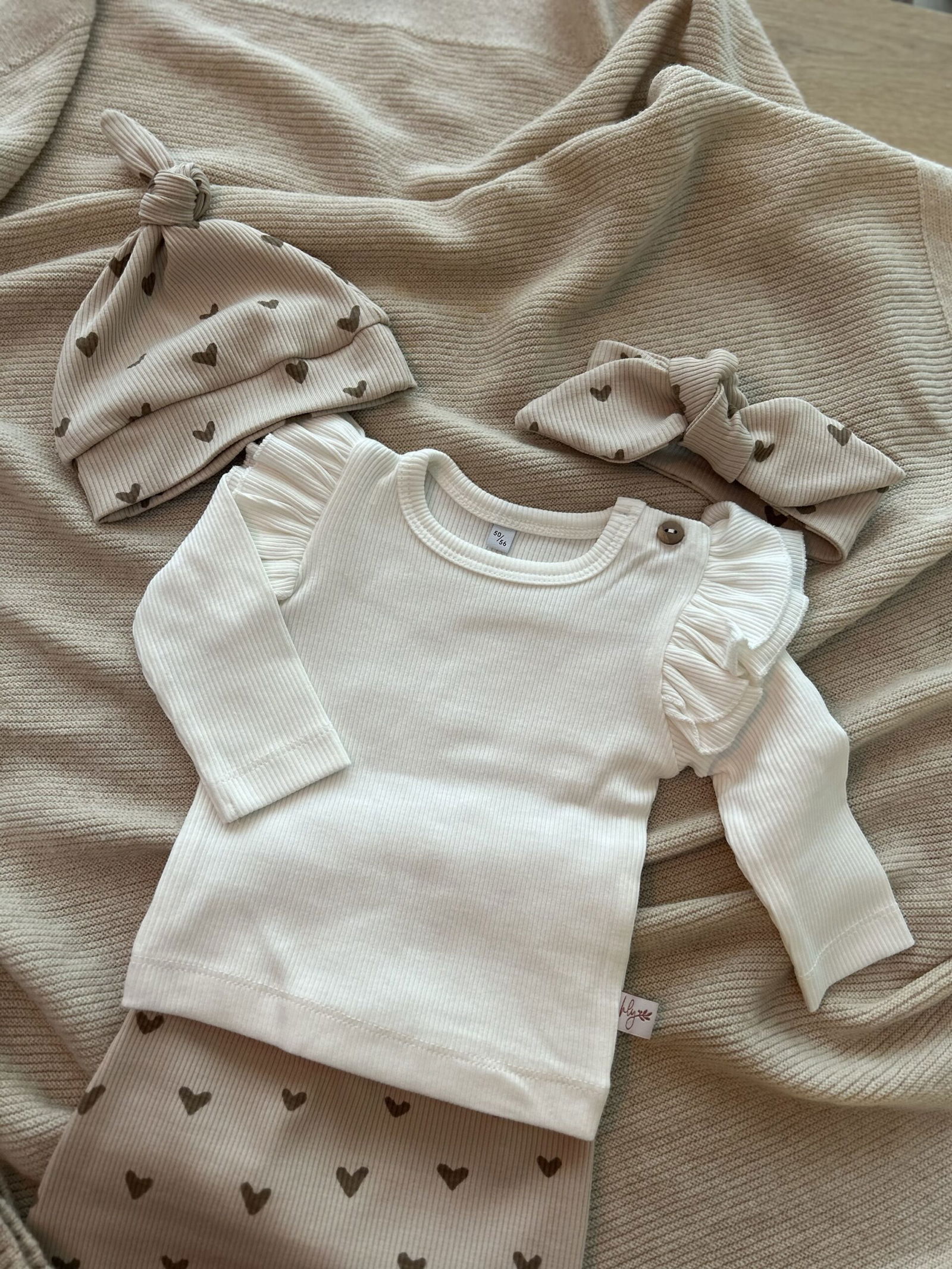 Kleur: zandkleur en taupe/bruine hartjes