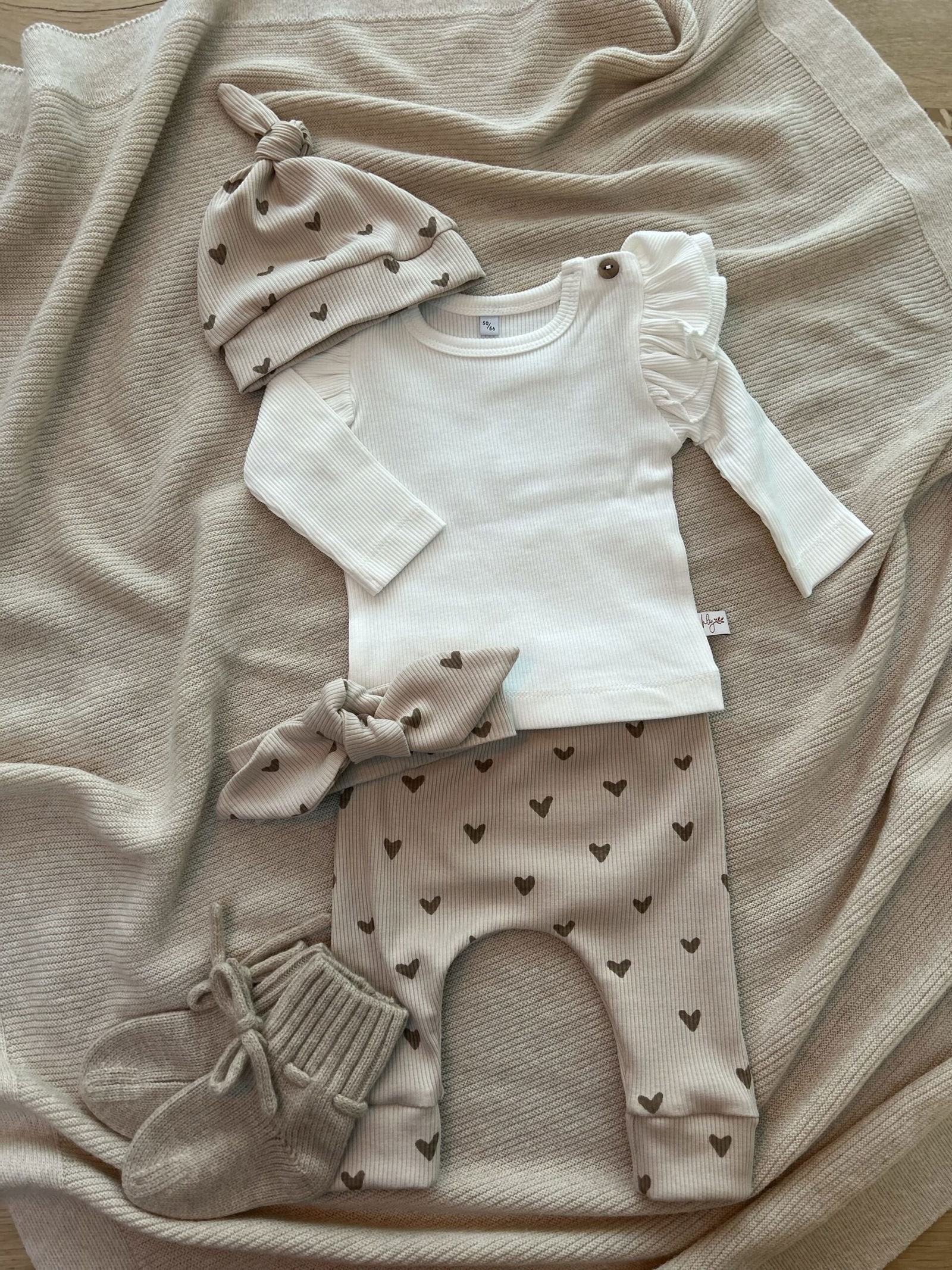 Deze legging met lief hartjesprintje is gemaakt van een soepele ribstof die makkelijk te combineren is met één van de overslagshirtjes of longsleeves. Door de zachte stof is het broekje gemakkelijk aan te trekken en kan jouw kleintje hier vrij in bewegen. De legging is ook leuk om te combineren met één van de newborn mutsjes en de blouse embroidery! Aan de bovenkant van de legging zit elastiek, zodat het broekje niet afzakt.