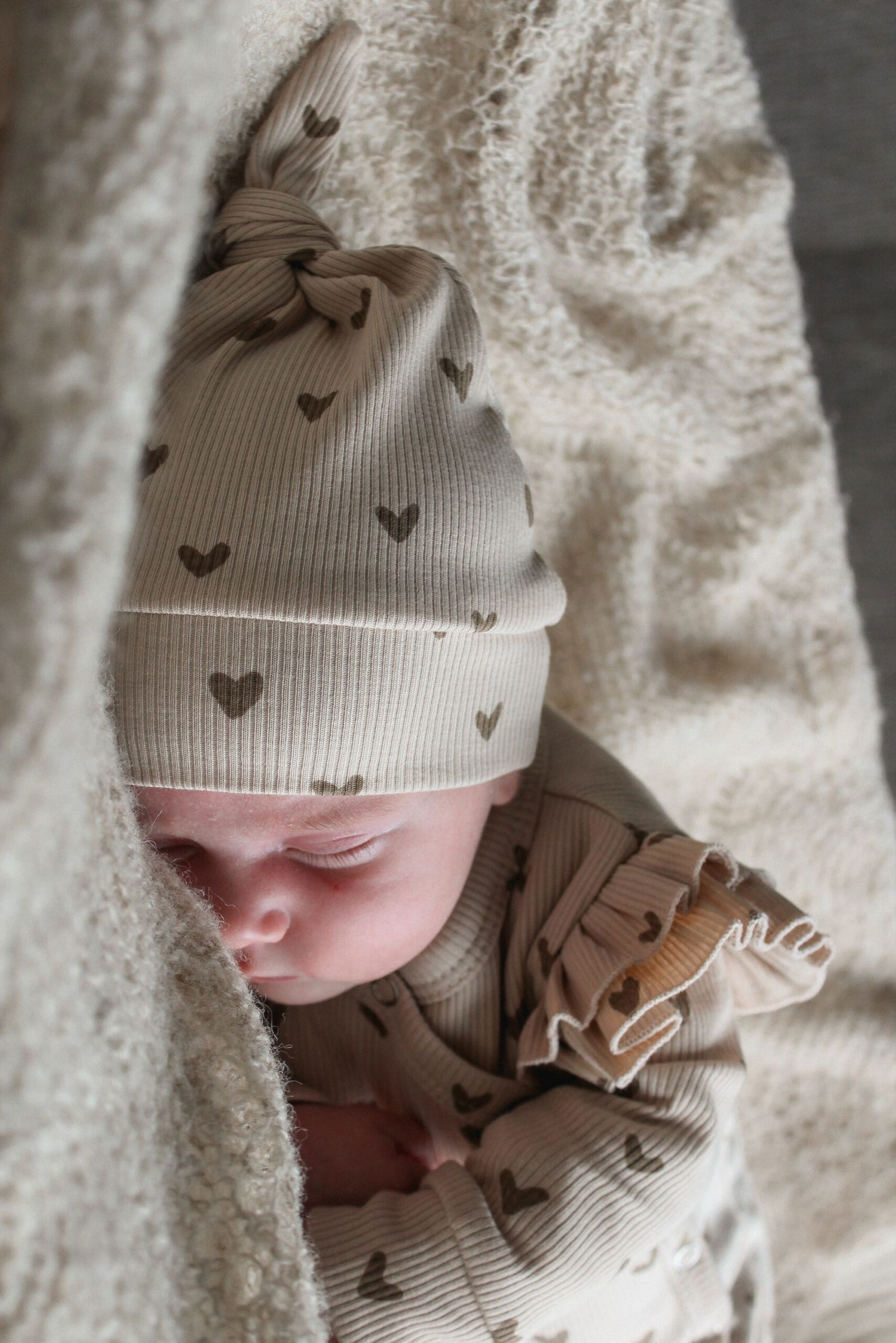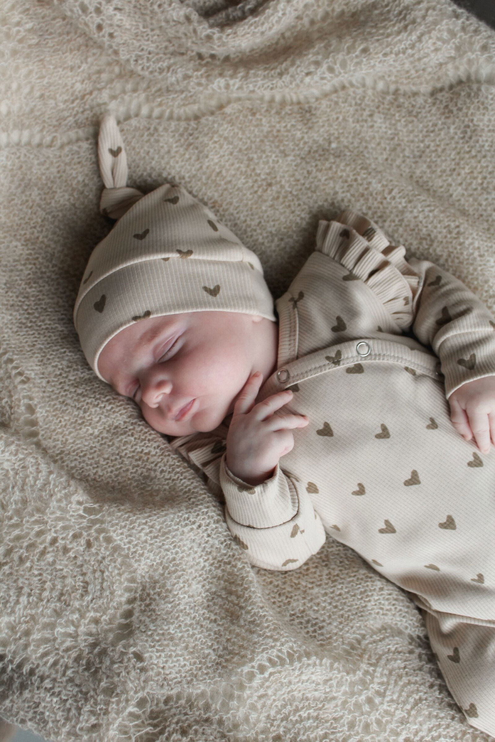 De newborn mutsjes zijn een musthave voor de eerste weken na de geboorte. Pasgeboren baby’s kunnen zichzelf nog moeilijk warm houden en een mutsje helpt om de warmte vast te houden. Het mutsje is gemaakt van een ribstof met lichte stretch waardoor je het makkelijk over het hoofdje trekt. Combineer het mutsje met een boxpakje met ruffle in dezelfde print en een paar off white merino wollen slofjes voor een complete outfit voor je newborn.